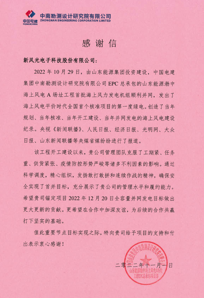 With the first "green power" from the first approved project in the national offshore wind power for “parity era” in China, we received a letter of appreciation from Power China, Zhongnan Engineering Co., Ltd, which is as follows.