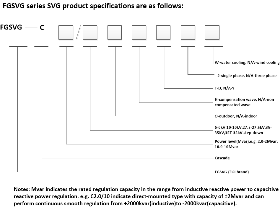 1. Capacity (Mvar) refers to the rated regulation capacity within the dynamic regulation range from inductive reactive power to capacitive reactive power.